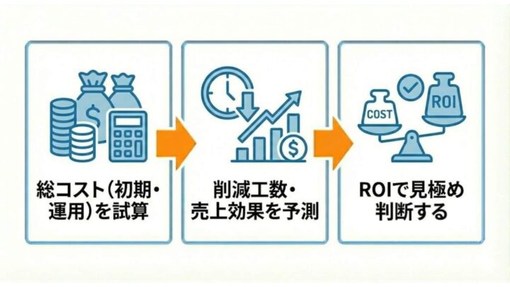 AI導入では、初期費用だけでなく運用コストも含めて総合的に判断する必要があります。投資回収期間(ROI)が明確に見込めるかどうかをシビアに見極めましょう。