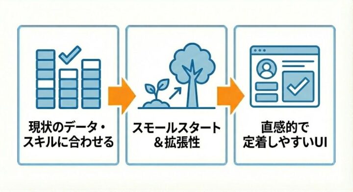| ・現在のデータ整備状況や運用担当者のスキルに見合ったツールを選ぶ ・最初から大規模導入せず、スモールスタートが可能で拡張性のあるツールか確認する ・現場が直感的に使いやすく、定着しやすいUI/UXのツールを選ぶ |