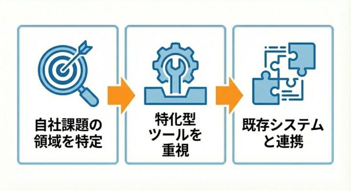 | ・自社の課題が「予測・分析」「コンテンツ制作」「顧客対話」のどこにあるか特定する ・「あれもこれも」と多機能さを求めるよりも、特定課題の解決に特化したツールを重視する ・既存のシステム環境(MAやCRMなど)との親和性や連携のしやすさを確認する |