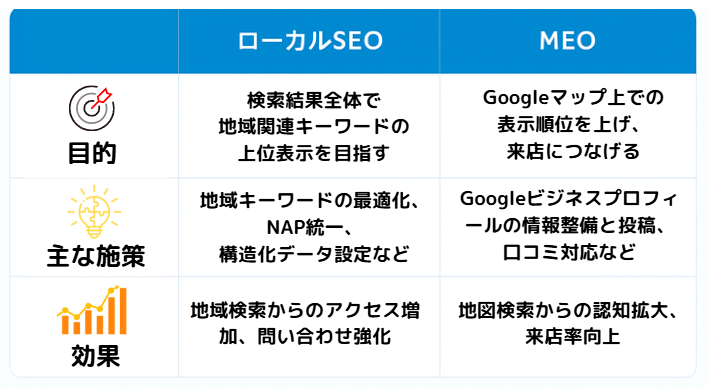 以下にローカルSEOとMEOの主な違いをまとめました。ローカルSEOとMEOを併せて運用することで地域検索からの認知・来店を最大化できます。