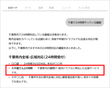 「千葉で24時間やっている鍵屋」という検索において、GoogleのAIモードに引用された事例が確認されました。